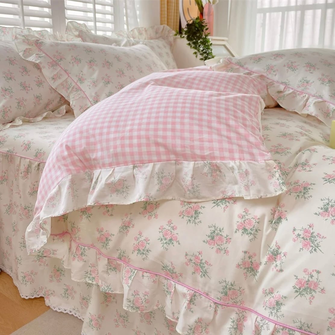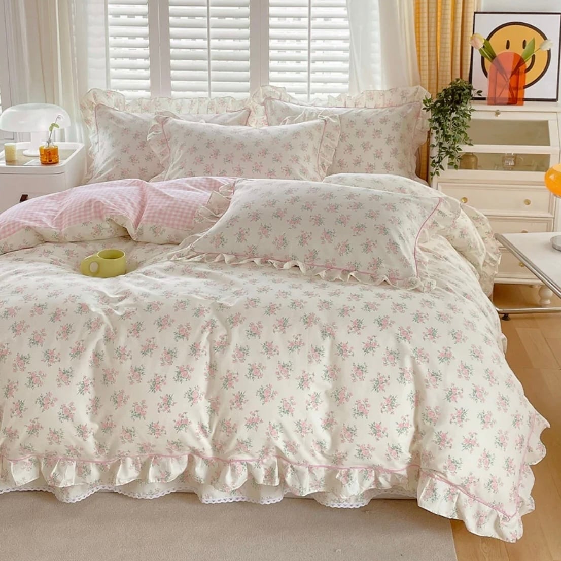 花柄×フリルの布団カバーセット|ホワイト×ピンク